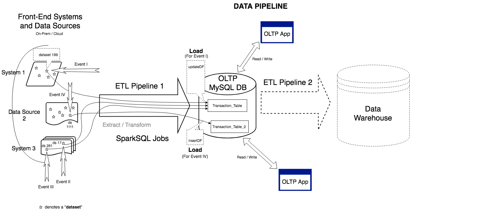 As we’ve seen, the SparkSQL jobs in Pipeline 1 appear to perform a typical ETL duty. In this series, we are not concerned with their EXTRACT and TRANSFORM steps. That is, we don’t care how the jobs read datasets from the front-end or how they transform and move data along the way. Put it another way, we don’t care how the insertDF and updateDF get formed. To our concern, they are somehow “magically” handed over to us.